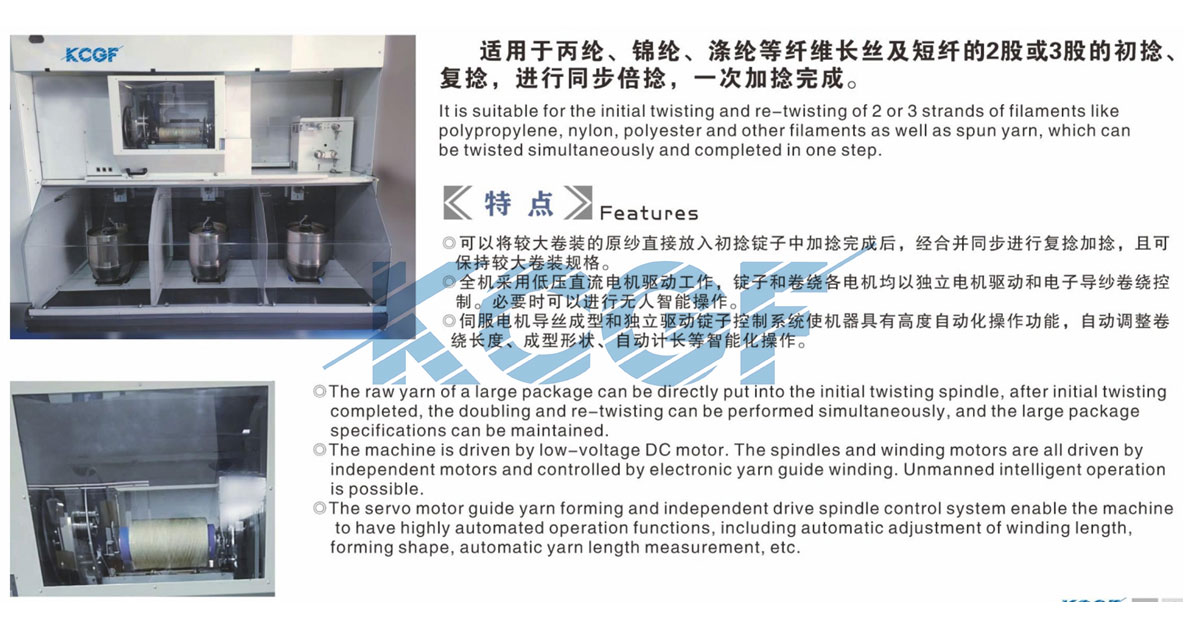 适用于丙纶、锦纶、涤纶等纤维长丝及短纤的2股或3股的初捻复捻,进行同步倍捻,一次加捻完成