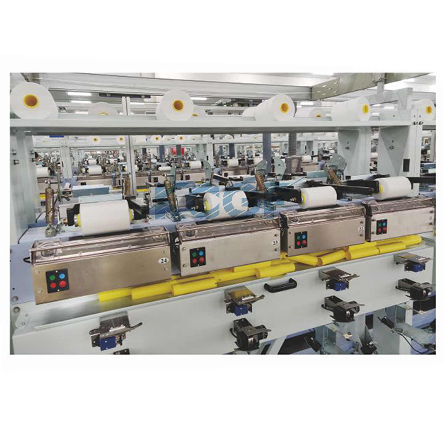 KC500A 工业丝双倍捻机,适用于丙纶、锦纶等纤维长丝及短纤的 2 股或 3 股初捻、复捻,可一次加捻完成,支持无人智能操作;另有填补国内空白的大卷装倍捻机等机型。